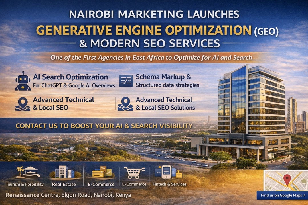Nairobi Marketing, a full-service digital marketing agency headquartered at Renaissance Centre, Elgon Road, Nairobi, Kenya, today announced the formal launch of its Generative Engine Optimization (GEO) and SEO services, making it one of the first agencies in East Africa to offer businesses a structured pathway to visibility in both traditional search and AI-powered platforms including Google AI Overviews, ChatGPT, and Perplexity.