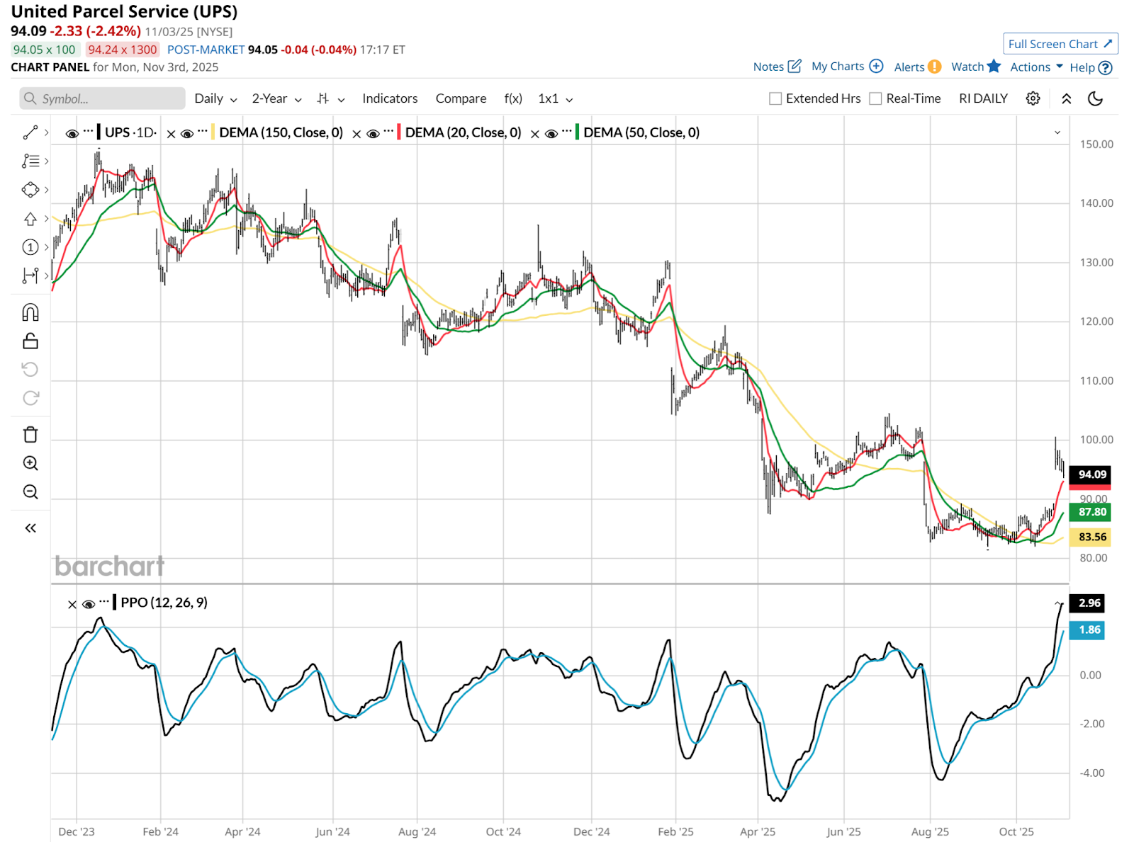 UPS rallied recently, but its Percentage Price Oscillator (PPO) indicator in the bottom section of this chart indicates to me that risk has elevated again. So quickly, too. PPO at the top of its daily chart range is not a done deal, but as you can see from the other recent peaks, it makes it tougher for the stock to rise much from here. Keep that in mind next time a stock pops on earnings, but is still in a downtrend, like UPS is.