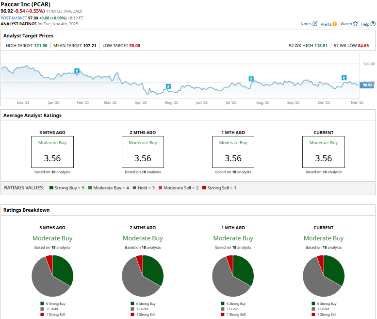 Among the 18 analysts covering the PCAR stock, the consensus rating is a “Moderate Buy.” That’s based on six “Strong Buys,” 11 “Holds,” and one “Strong Sell.”