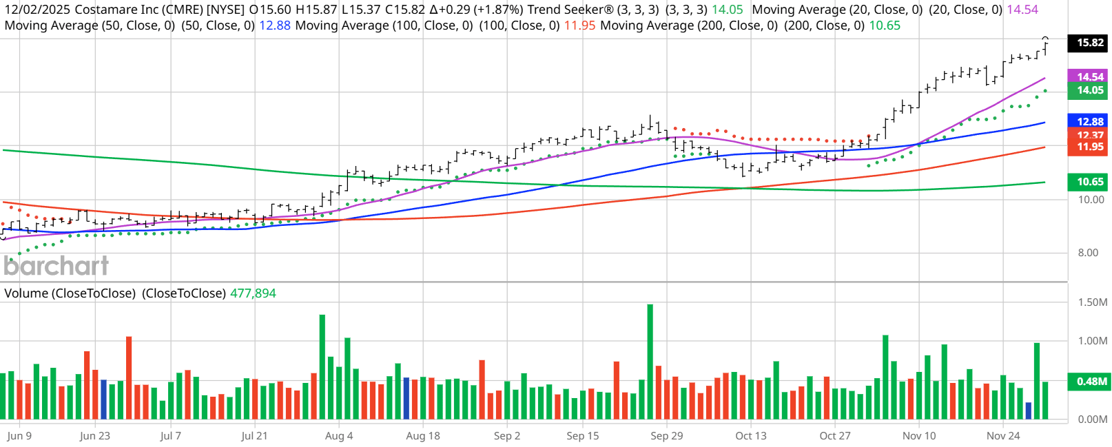 I found today’s Chart of the Day by using Barchart’s powerful screening functions to sort for stocks with the highest technical buy signals; superior current momentum in both strength and direction; and a Trend Seeker “buy” signal. I then used Barchart’s Flipcharts feature to review the charts for consistent price appreciation. CMRE checks those boxes. Since the Trend Seeker signaled a new “Buy” on Nov. 3, the stock has gained 29.61%.