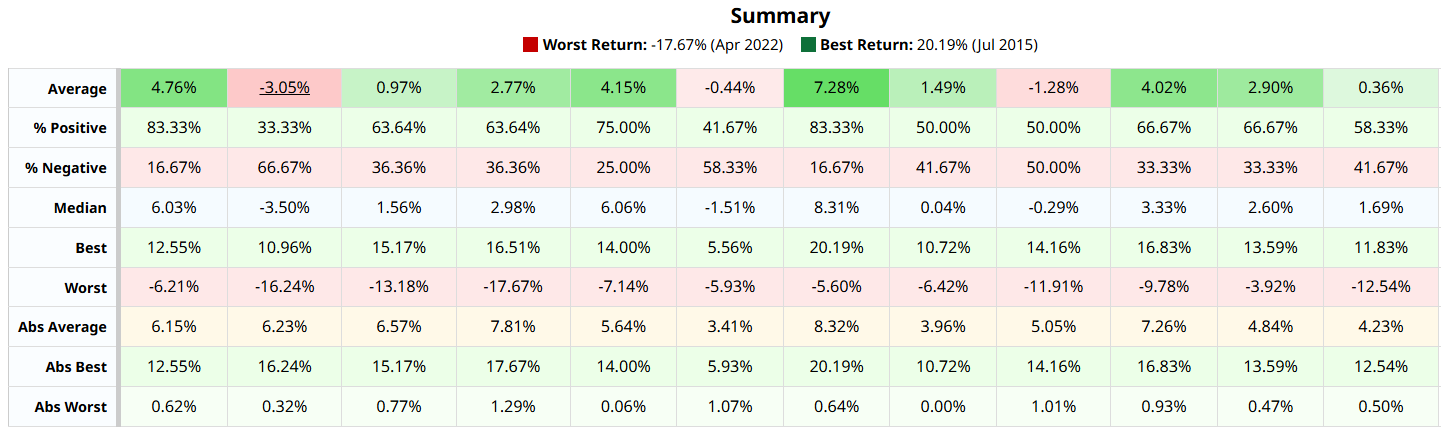 One mechanism through which we can achieve this goal while staying strictly with Barchart’s tools is through Seasonal Returns.