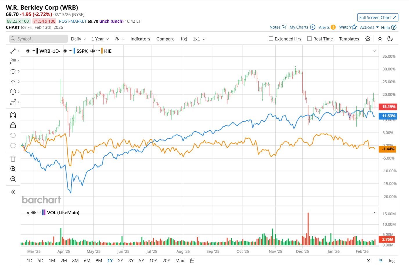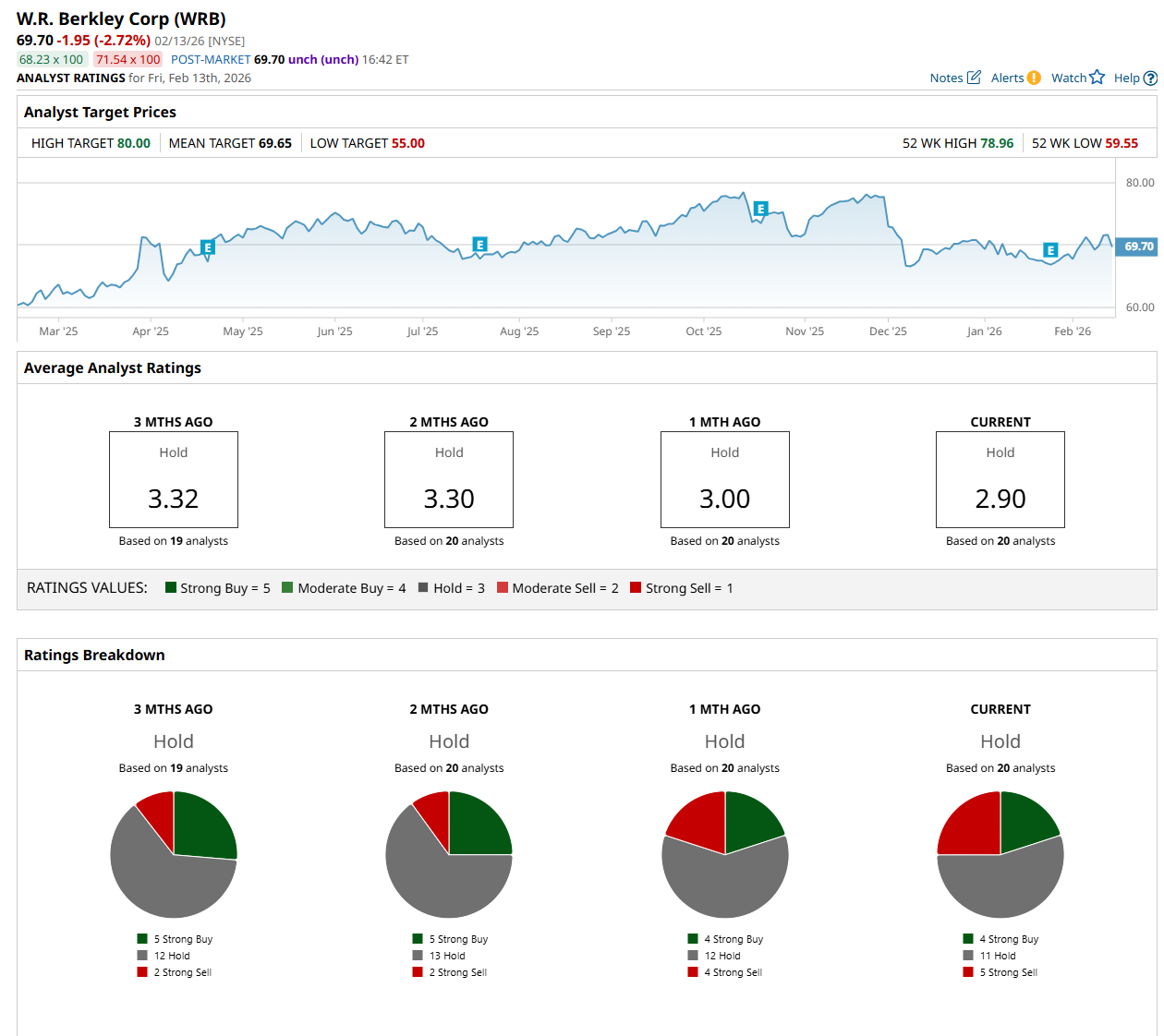 On Feb. 2, Cantor Fitzgerald analyst Ryan Tunis maintained an "Overweight" rating on WRB but lowered its price target to $75, indicating a 7.6% potential upside from the current levels.