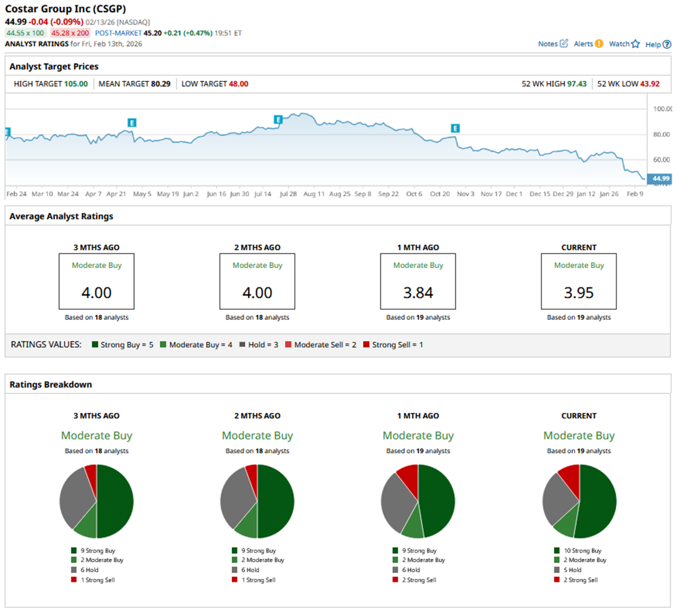 CSGP stock has a consensus “Moderate Buy” rating overall. Of the 19 analysts covering the stock, opinions include 10 “Strong Buys,” two “Moderate Buys,” five “Holds,” and two “Strong Sells.”