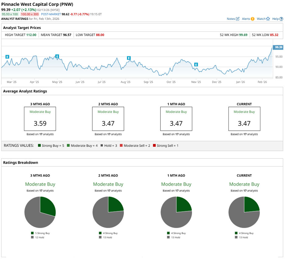 Wall Street continues to take a measured but constructive stance on Pinnacle West. Analysts have assigned PNW stock an overall rating of “Moderate Buy.” Of the 17 analysts covering the stock, four recommend “Strong Buy,” while the remaining 13 suggest “Hold.”