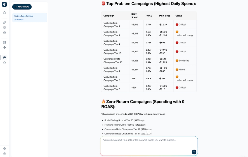 This capability is particularly vital for PPC campaign management, where real-time shifts in metrics like CPC or bidding directly affect ROI. AI Agent enables teams to detect these changes instantly, whether it is identifying wasted spend or spotting low-cost lead opportunities, and reallocating budgets before money is lost.