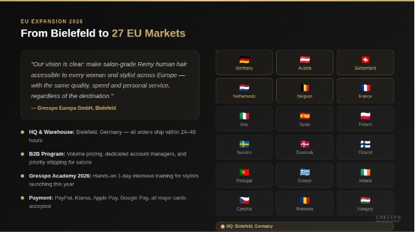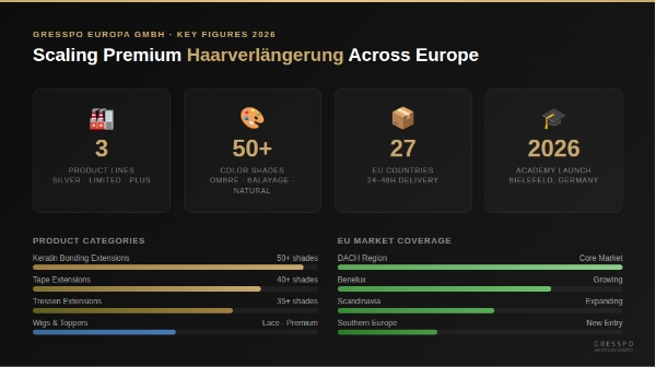 BIELEFELD, GERMANY - March 17, 2026 - Gresspo Europa GmbH, a Bielefeld-based specialist in premium Remy human hair products, has completed a pan-European distribution rollout covering all 27 EU member states. The company now ships salon-grade Haarverlängerung products — keratin bondings, tape extensions, weft systems, wigs and professional cosmetics — from its German warehouse within 24 to 48 hours of order placement.