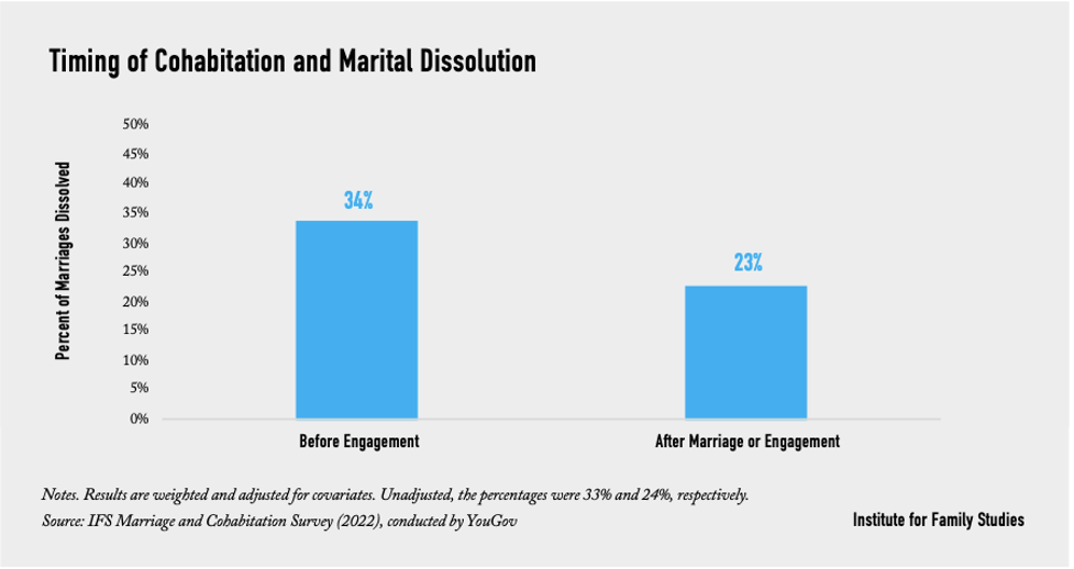 - Moving in together before being married or engaged is associated with a higher risk of divorce. Specifically, 34% of marriages ended among those who cohabited before being engaged, compared to 23% of marriages for those who lived together only after being engaged, or already married, and 24% of marriages for those who did not live together at all (the latter two groups are not statistically different in their likelihood of divorcing). In relative terms, the marriages of those who moved in together before being engaged were 48% more likely to end than the marriages of those who only cohabited after being engaged or already married.