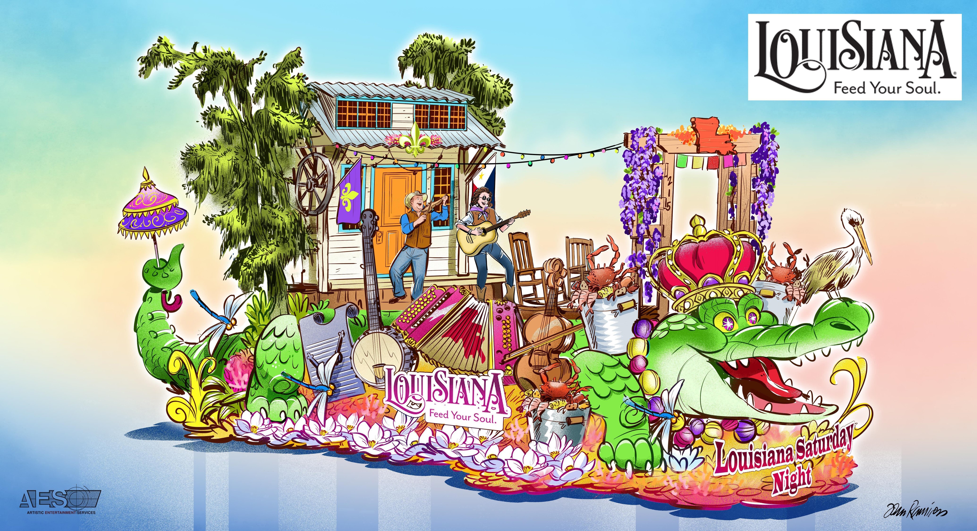 Louisiana’s 2025 Tournament of Roses Parade® float features a giant playful alligator wearing a crown and Mardi Gras beads while clutching a second-line umbrella in its tail. Riding on its back is a Cajun dance hall and porch, along with cypress trees, Louisiana musical instruments, seafood, and wildlife. Performing his rendition of “Louisiana Saturday Night” will be rising country star Timothy Wayne.