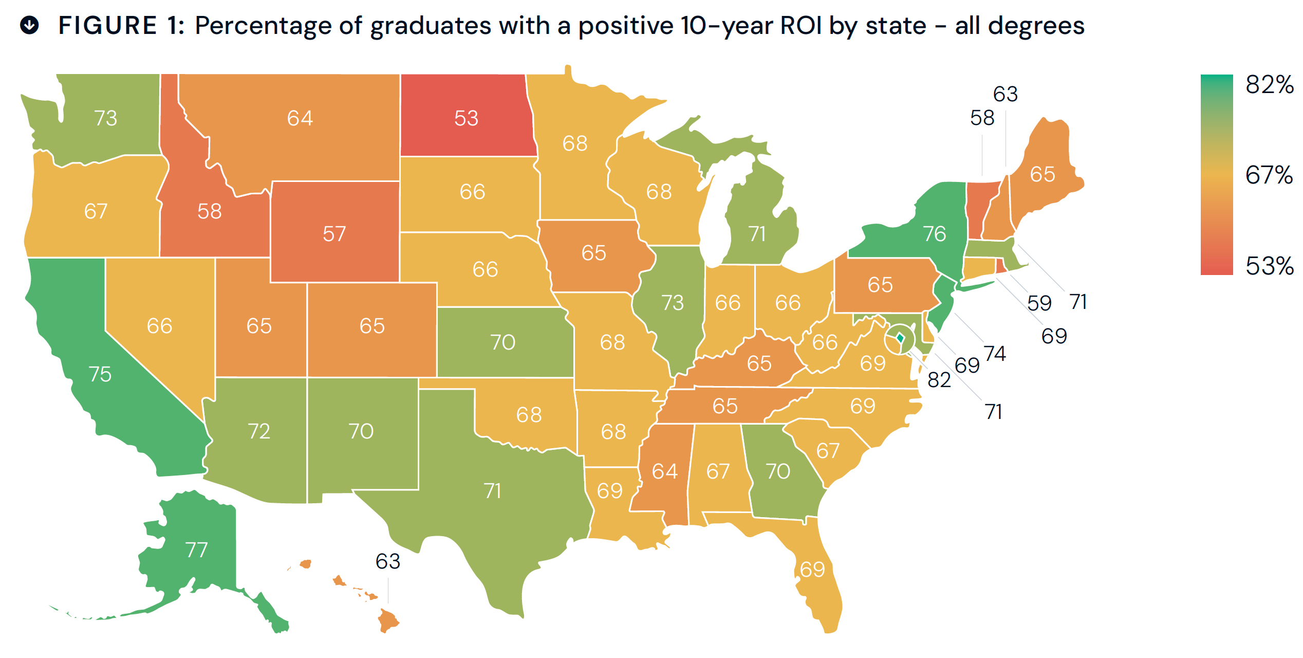 By state, the percentage of all graduates from both two- and four-year institutions who can expect to experience a positive return on investment within 10 years ranges from a high of 82 percent in Washington, D.C., to a low of 53 percent in North Dakota.