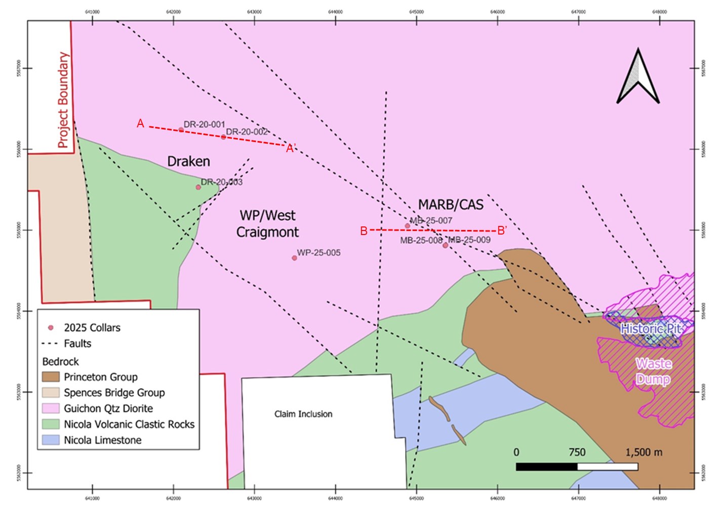 Three targets (Figure 1) were drilled in Nicola's 2025 program: MARB-CAS, Draken and a new target at WP/West Craigmont identified by ALS Geoanalytics1. The purpose of the 2025 Program was to collect geological data for target development for a potential porphyry copper system at New Craigmont. 1