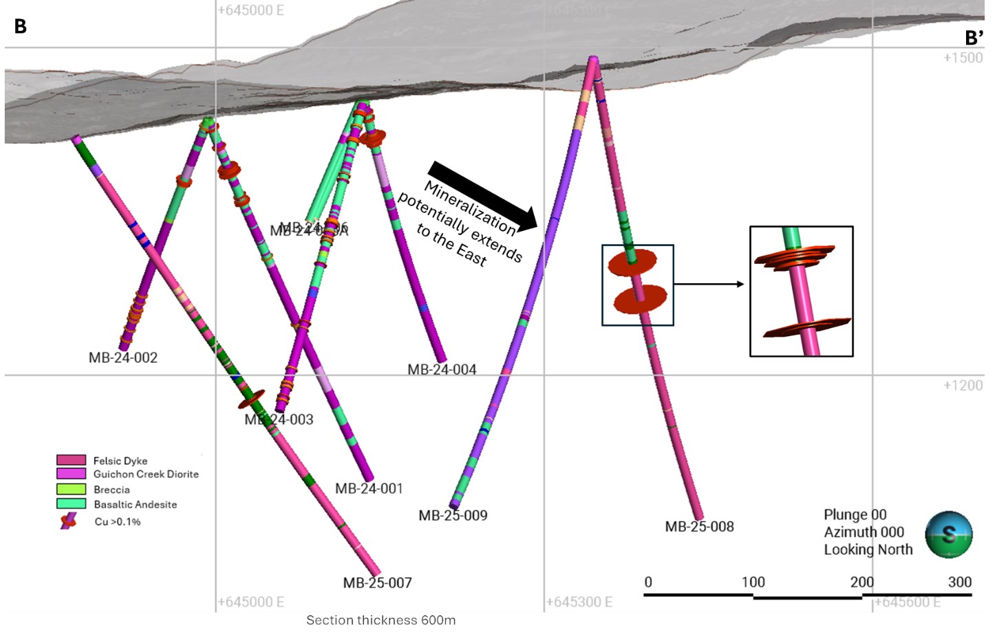 Copper results from MARB are encouraging with MB-25-008 returning 9.5m of 0.39% Cu from 220.5m to 230.0m (Figure 5 and Table 2). This interval consists of a Nicola Group basalt fragmental package with mixed patches of intercalated sandstone, siltstone and fragmental units and a porphyritic andesitic section within. A number of well-preserved quartz-K-feldspar-biotite dykes are enveloped by quartz diorite dykes. Alteration includes pervasive quartz-chlorite with fine-grained biotite. Mineralization consists of disseminated magnetite, trace disseminated pyrite. Fine-grained chalcopyrite, along with pyrite, occurs within quartz stringers with magnetite and chlorite. Nicola geologists interpret the mineralization occurring at MARB to be associated with the skarn at Embayment and CAS. More drilling will be required to demonstrate continuity.