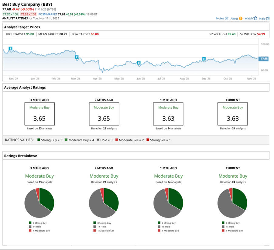 Among the 24 analysts covering BBY stock, the consensus is a “Moderate Buy.” That’s based on eight “Strong Buy” ratings, 15 “Holds,” and one “Moderate Sell.”