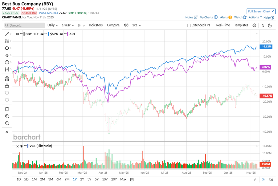 Shares of this tech retail giant have underperformed the broader market considerably over the past year. BBY has declined 13% over this time frame, while the broader S&P 500 Index ($SPX) has rallied nearly 14.1%. In 2025, BBY’s stock fell 9.5%, compared to the SPX’s 16.4% rise on a YTD basis.