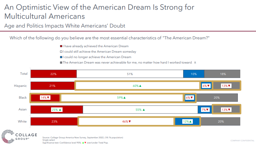 “Both Hispanic and Black Americans are more confident about their futures in comparison to other American segments, and this conviction translates to their faith in pursuing and achieving the American Dream,” said Jack Mackinnon, Senior Director of Cultural Insights at Collage Group. “We also allowed people to select what they think constitutes the American Dream and notably, most Americans define the Dream in practical terms, like owning a home, being able to retire, freedom to live how they want, and a stable family life.”