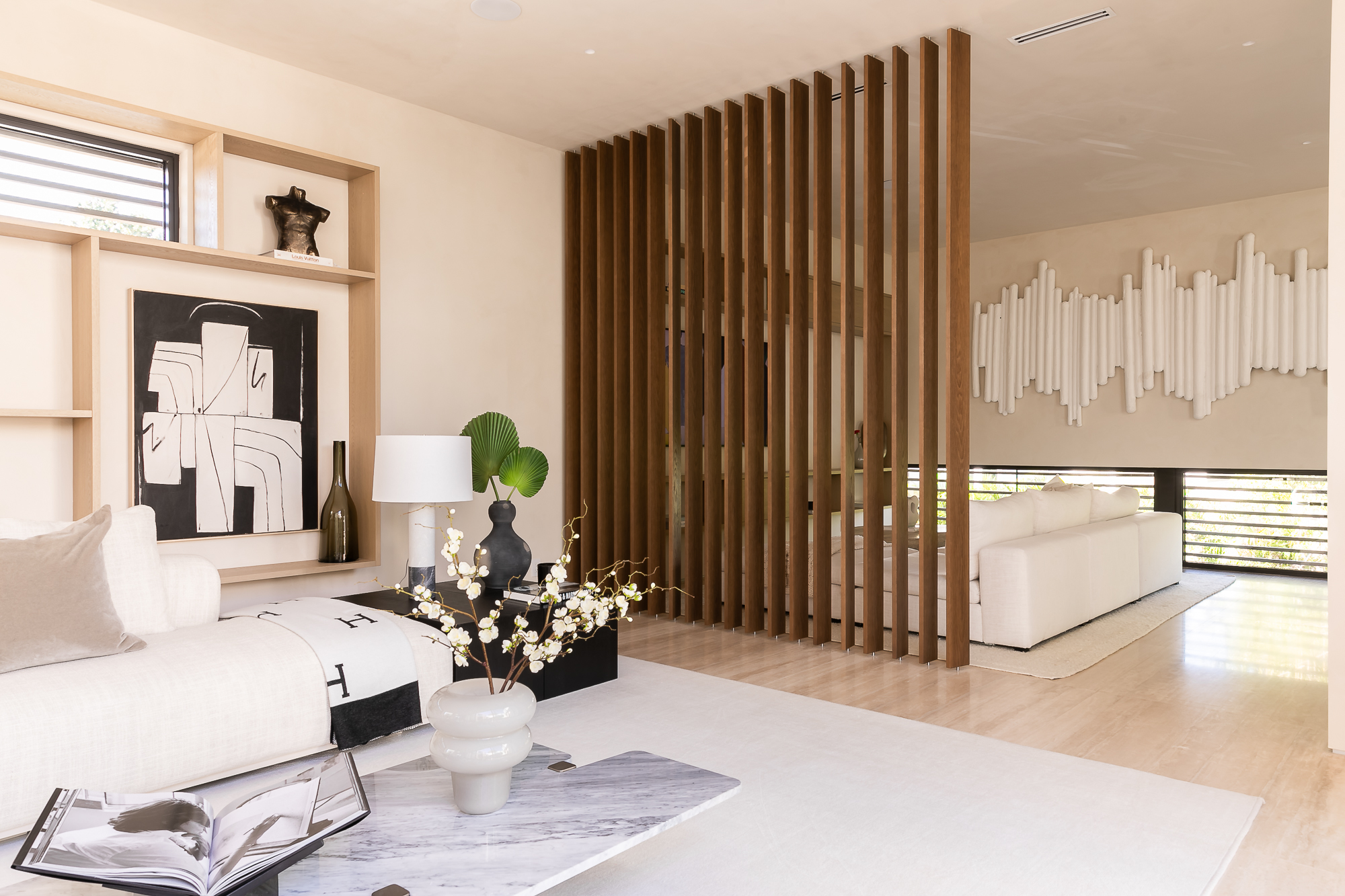 The rationalist facade, adorned with natural stone cladding, displays a commitment to clear design principles. Inside, La Corte presents a refined atmosphere with custom Italian millwork, oversized travertine floors, limewash paint on all walls and ceilings, and European Oak. JO/GA collaborated with luxury staging firm Interior Marketing Group (IMG), which added a layer of livable sophistication by integrating bespoke furnishings and original artworks to enhance the space.