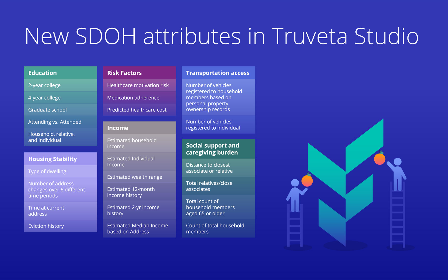BELLEVUE, Wash., March 01, 2023 (GLOBE NEWSWIRE) -- Truveta announced the expansion of its de-identified data to include 28 additional social drivers of health (SDOH) attributes – such as education, income, housing stability, social support, and more – for nearly 80 million de-identified patient journeys across all 50 US states. Available now for research in Truveta Studio™, these 45 depth per-patient SDOH attributes empower researchers with new health equity scenarios to study health disparities and improve patient care in America.