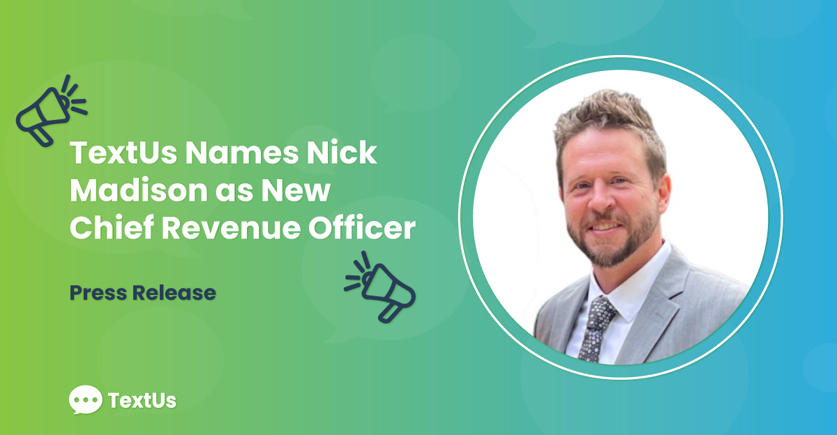 Denver, Colorado, Sept. 15, 2023 (GLOBE NEWSWIRE) -- TextUs, the leading text messaging platform that allows businesses to have engaging two-way conversations at scale, welcomes Nick Madison, CRO, to its executive leadership team.