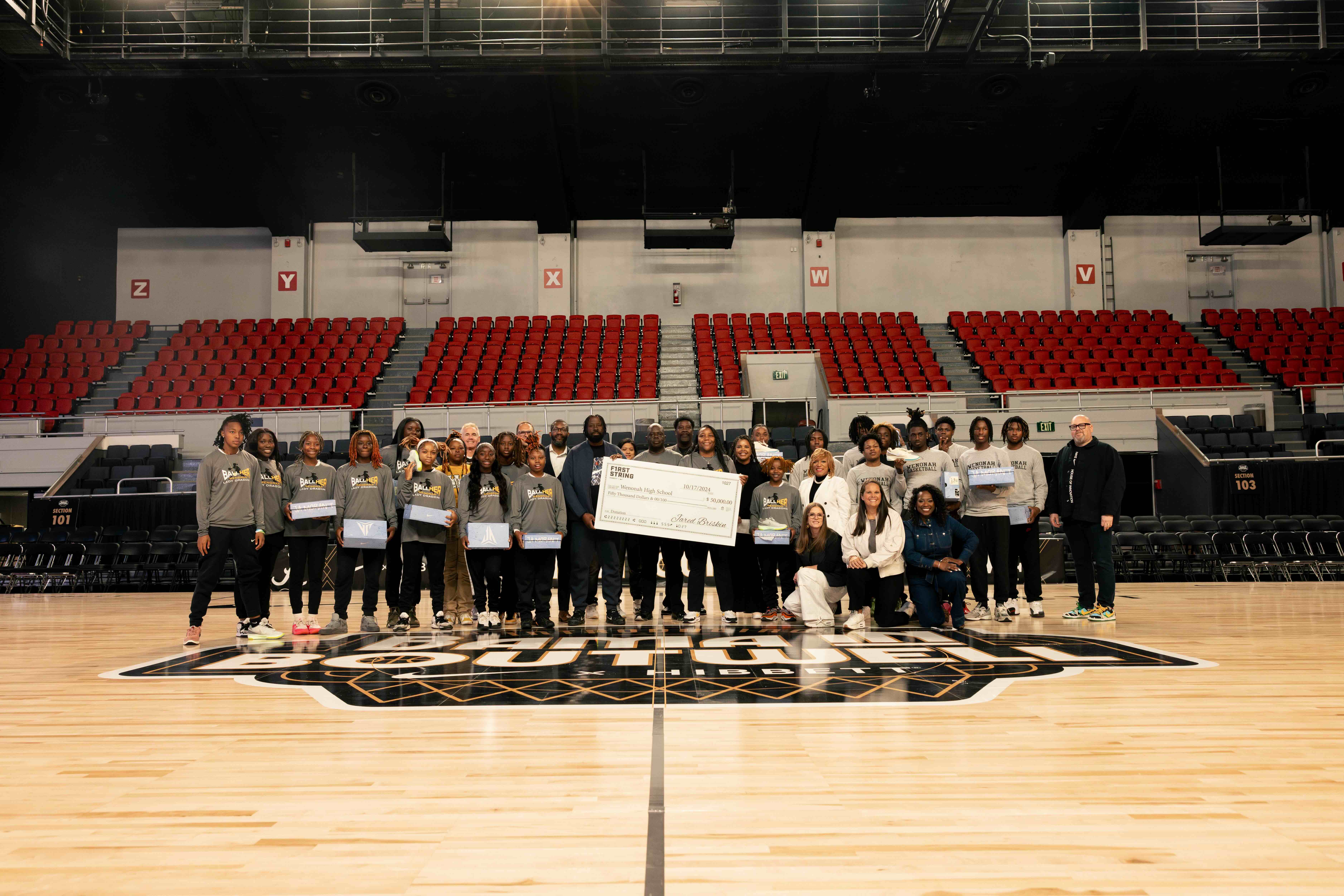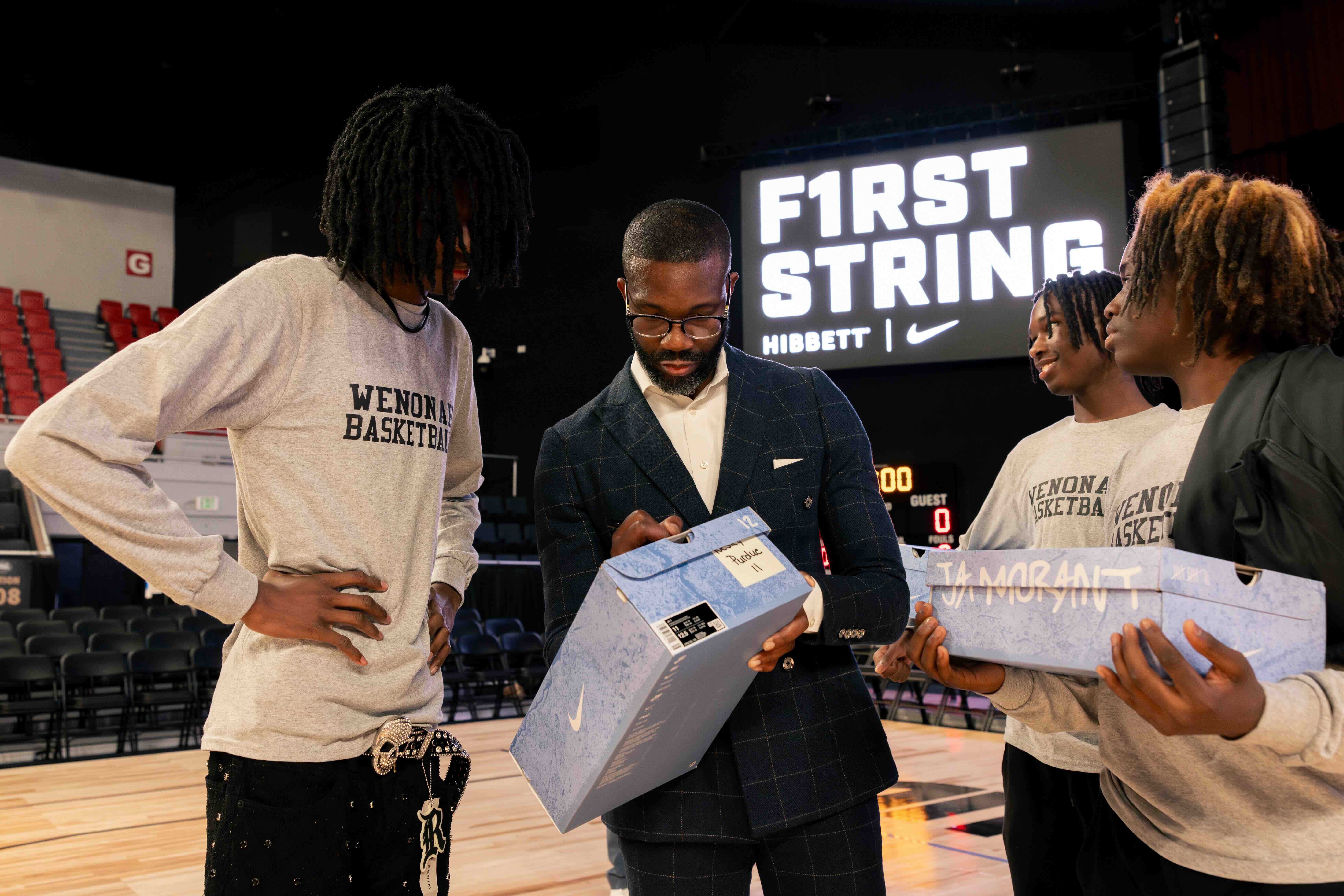Hibbett and Nike launched First String ahead of the inaugural Bama in Boutwell basketball game in Birmingham, Alabama. The Wenonah high school basketball teams participated in a shoot around with Jared Briskin, Hibbett President and Chief Operating Officer, Mayor Randall Woodfin and Samantha Williams, Birmingham Promise Executive Director. Ahead of the shoot around, Hibbett and Nike presented Wenonah with the $50,000 donation and surprised the players with the new Ja basketball shoes.