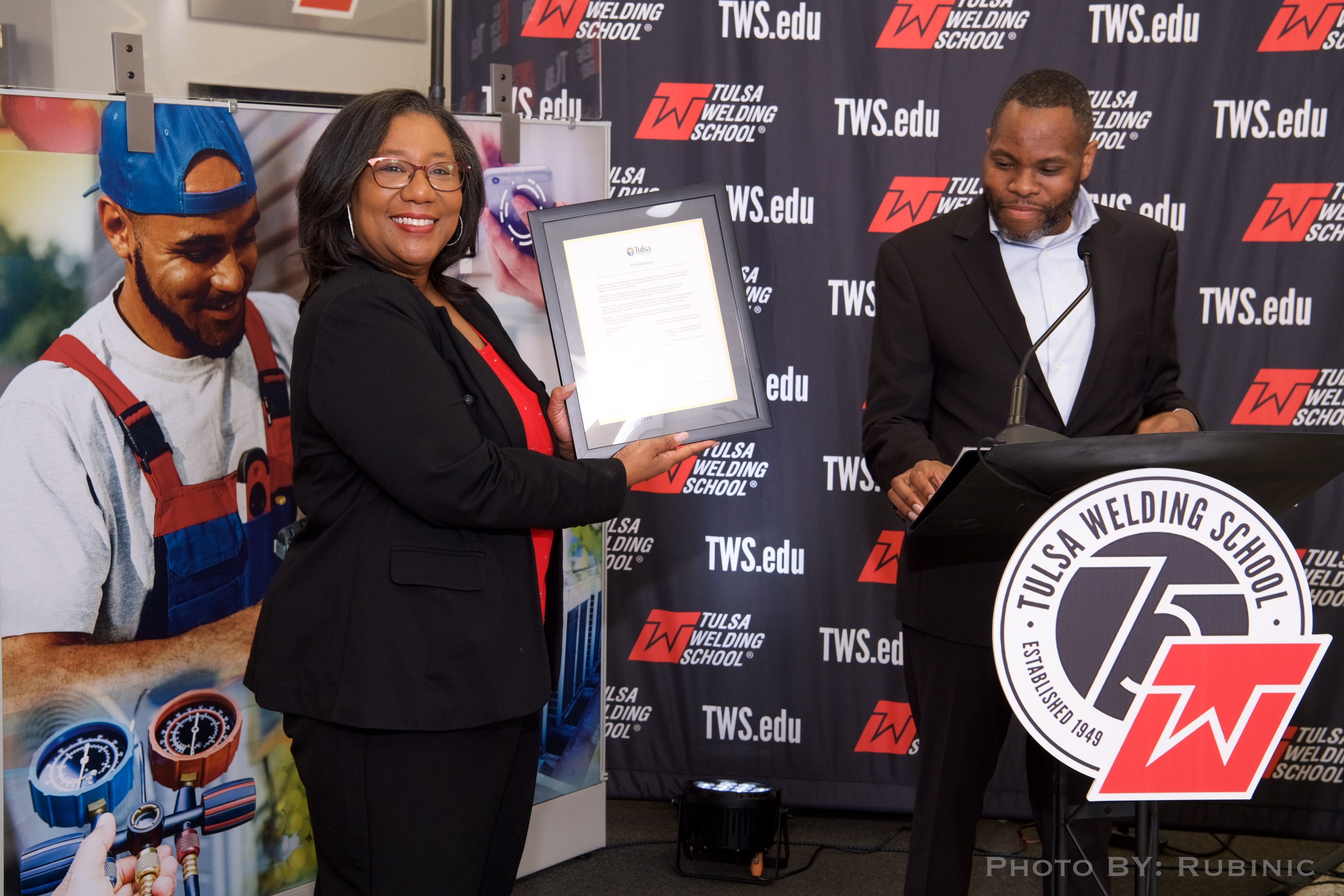 TWS celebrated the significant milestone with a special event on campus on Friday, April 5. TWS leadership welcomed current and past students, faculty, and local dignitaries to the campus, hosting tours and demonstrations throughout the day and answering questions about the school’s various programs and training opportunities. Ceremonies featured remarks from Powell, as well as StrataTech Chief Operating Officer Brandon Milligan, and special guest Leslie Osborn, Oklahoma Commissioner of Labor. While unable to attend, Tulsa Mayor G.T. Bynum presented TWS with a special proclamation, officially recognizing April 5, 2024, as “Tulsa Welding School 75th Anniversary Day.”