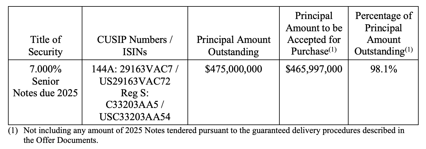 Holders of the 2025 Notes (“Holders”) who validly tendered, and did not validly withdraw, their 2025 Notes at or prior to the Expiration Time, or pursuant to the guaranteed delivery procedures described in the Offer Documents, will be eligible to receive in cash the consideration of $1,010.21 for each $1,000 principal amount of the 2025 Notes validly tendered, and not validly withdrawn, and accepted for purchase, plus accrued and unpaid interest on the 2025 Notes validly tendered and accepted for purchase from December 15, 2023, the last interest payment date, up to, but excluding, the Settlement Date.