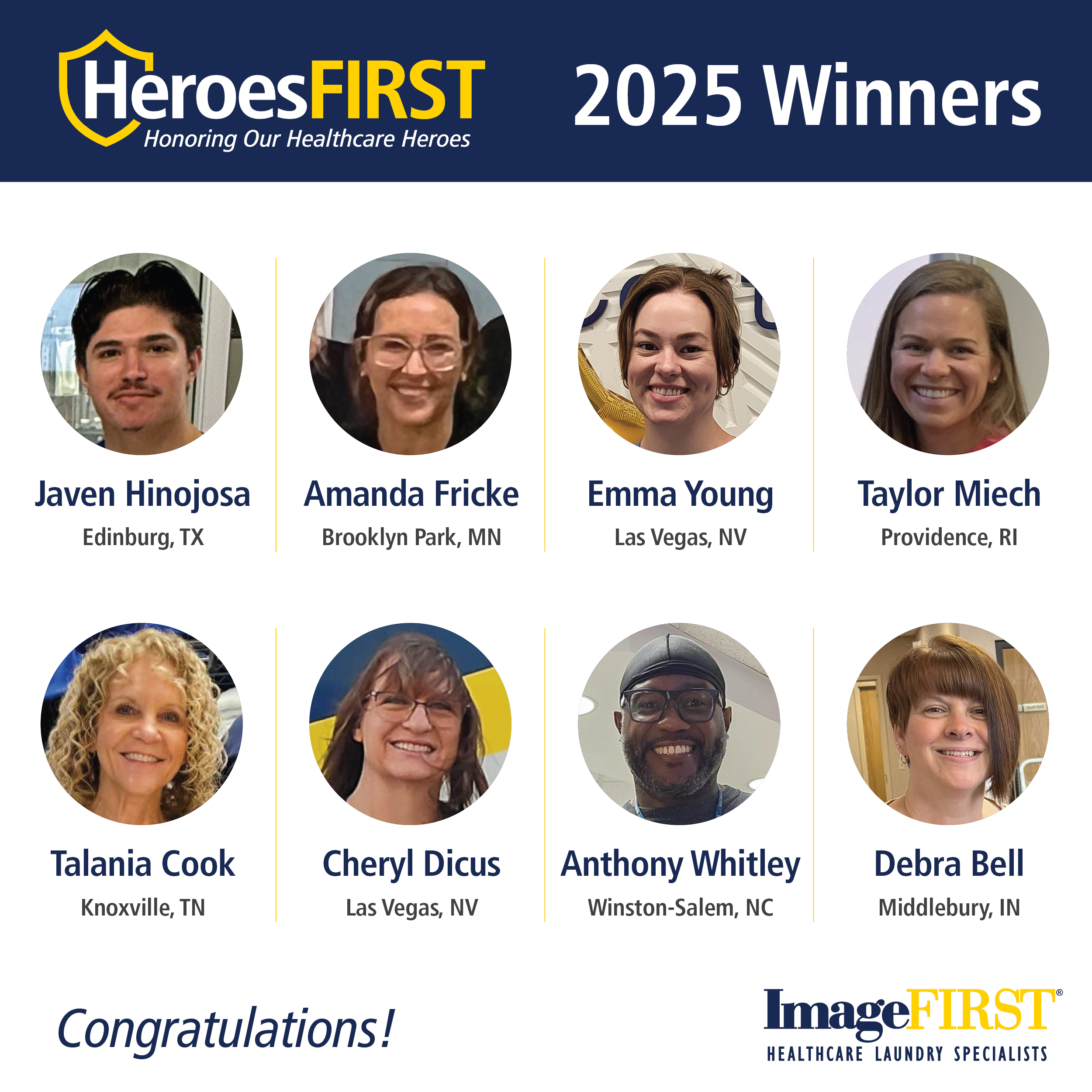King of Prussia, PA, Oct. 13, 2025 (GLOBE NEWSWIRE) -- ImageFIRST®, the leading national provider of linen, laundry and facility services specializing in the healthcare industry, announced the winners of its 5th Annual HeroesFIRST Contest. Each year, ImageFIRST Service Team members recognize exceptional Healthcare Heroes who go above and beyond to positively impact the lives of their patients. This year, more than 600 nominations were submitted nationwide. From those nominations, 20 Healthcare Heroes were selected as finalists. Votes were cast by the public on the contest’s website for the Hero who inspired them the most.