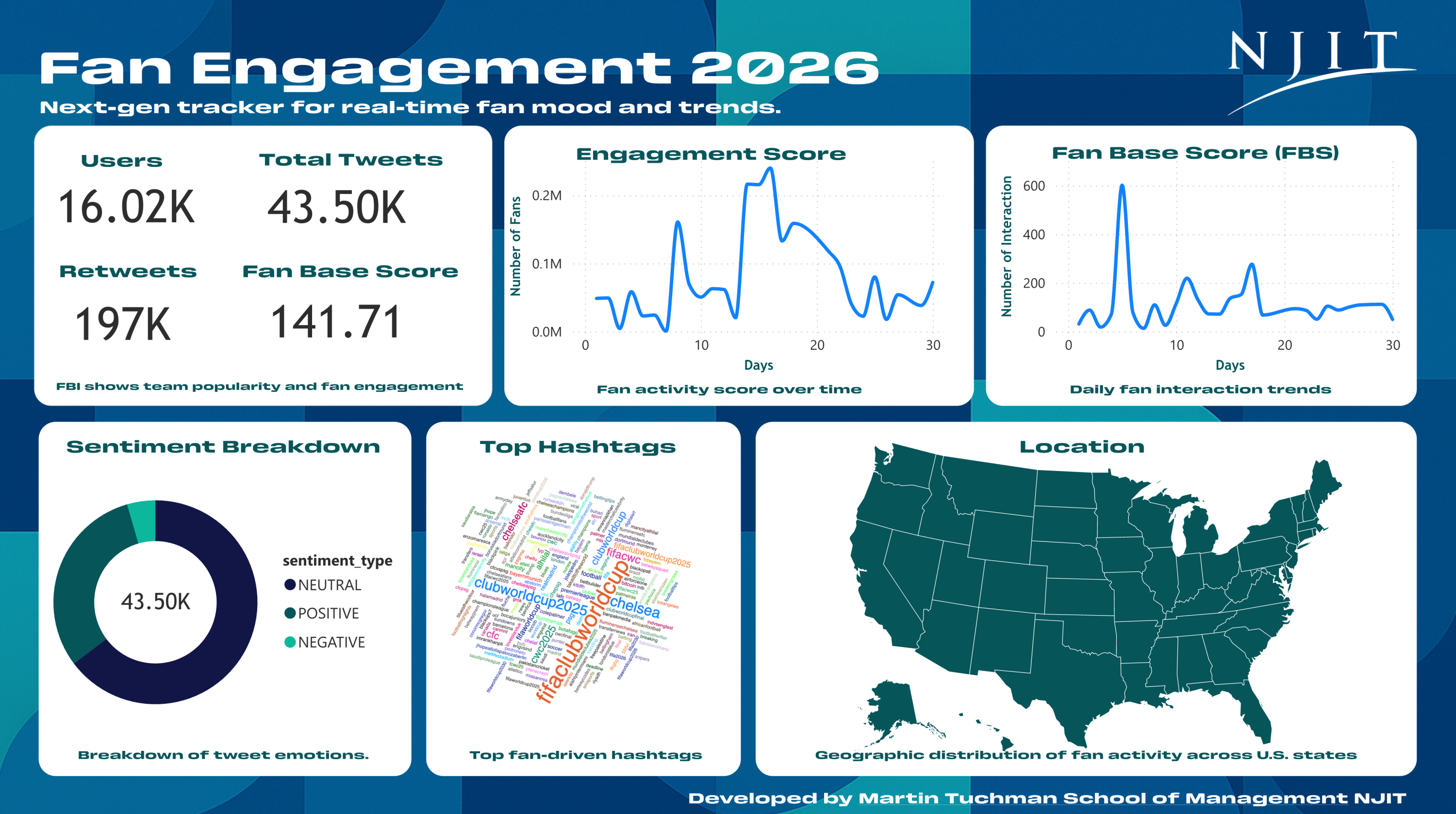 Developed and managed by students and faculty at NJIT’s Martin Tuchman School of Management (MTSM), the platform will measure and analyze fan reactions and sentiment before, during and after World Cup events, providing powerful insights into audience engagement. The dashboard aggregates data from social media and other online sources to capture fan sentiment and trends on a national scale, with particular focus on the New York/New Jersey region.